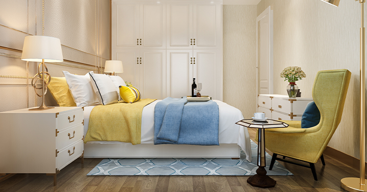 Space-saving and aesthetically pleasing features include floating side tables, multipurpose beds with storage, and built-in wardrobes with sliding doors. Your bedroom can also be made more tranquil by adding soft curtains or a few indoor plants. The focus should always be on comfort and functionality rather than excessive decoration.